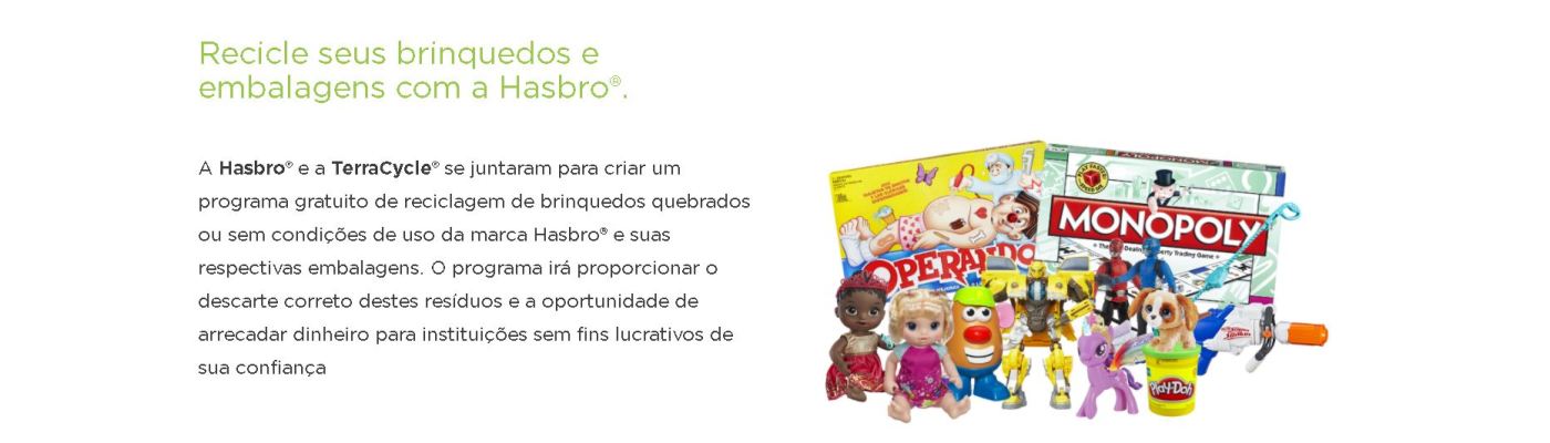 Nesse mês de outubro, a Hasbro® e a TerraCycle® se juntaram para criar um programa gratuito de reciclagem de brinquedos quebrados ou sem condições de uso da marca Hasbro® e suas respectivas embalagens. O programa irá proporcionar o descarte correto destes resíduos e a oportunidade de arrecadar dinheiro para instituições sem fins lucrativos de sua confiança. Não existe custo para enviar os brinquedos no link você pode saber mais informações.