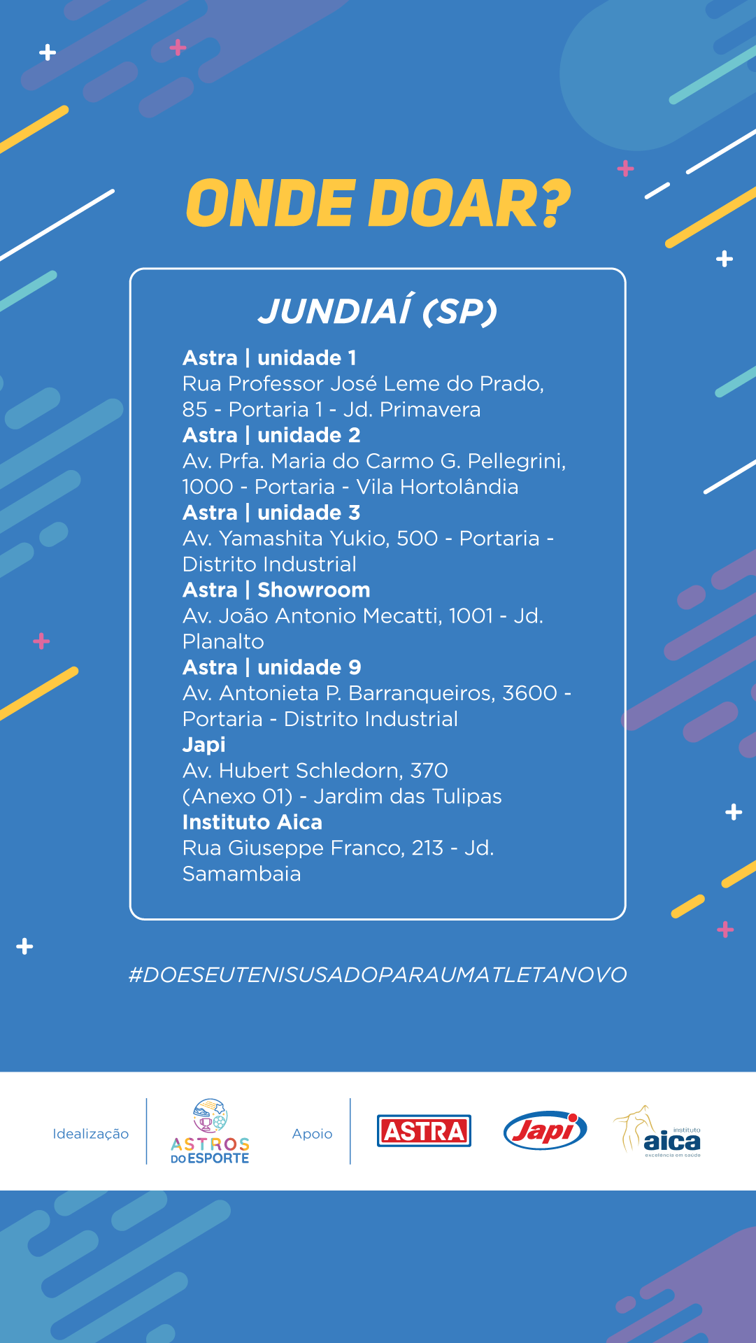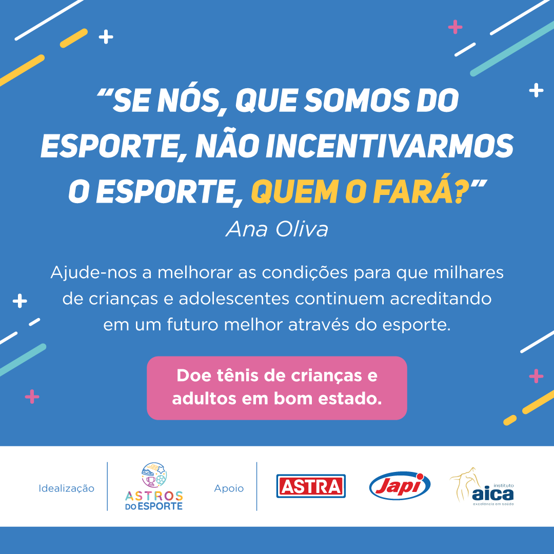 O projeto Astros do Esporte consiste na doação de tênis em bom estado, para crianças participantes de projetos esportivos.