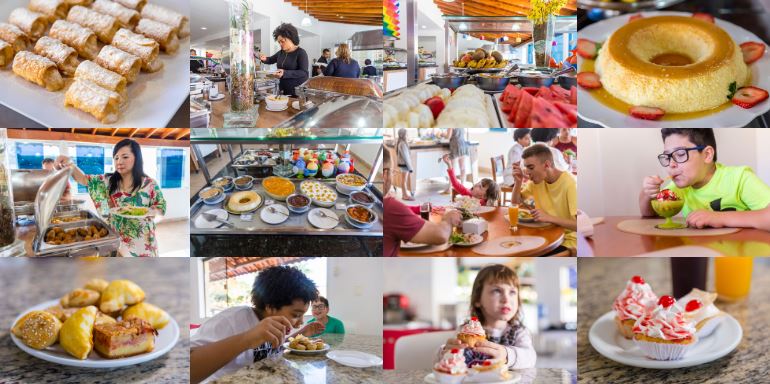 Café da manhã, petiscos na piscina, almoço, chá da tarde e jantar;